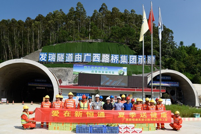 8月14-15日,新恒通公司黨委副書記、副董事長、總經理、總工程師藍日彥,公司黨委委員、常務副總經理蘇偉勝,公司黨委委員、副總經理、都巴高速指揮部黨支部書記、指揮長陸原恩一行到都巴高速五分部發瑞隧道出口、三分部紅水河特大橋施工現場,深入施工一線慰問都巴高速六個分部的一線工人,為他們送去了防暑降溫慰問品,表達了對一線工人的關懷,感謝他們炎炎夏日下的堅守。